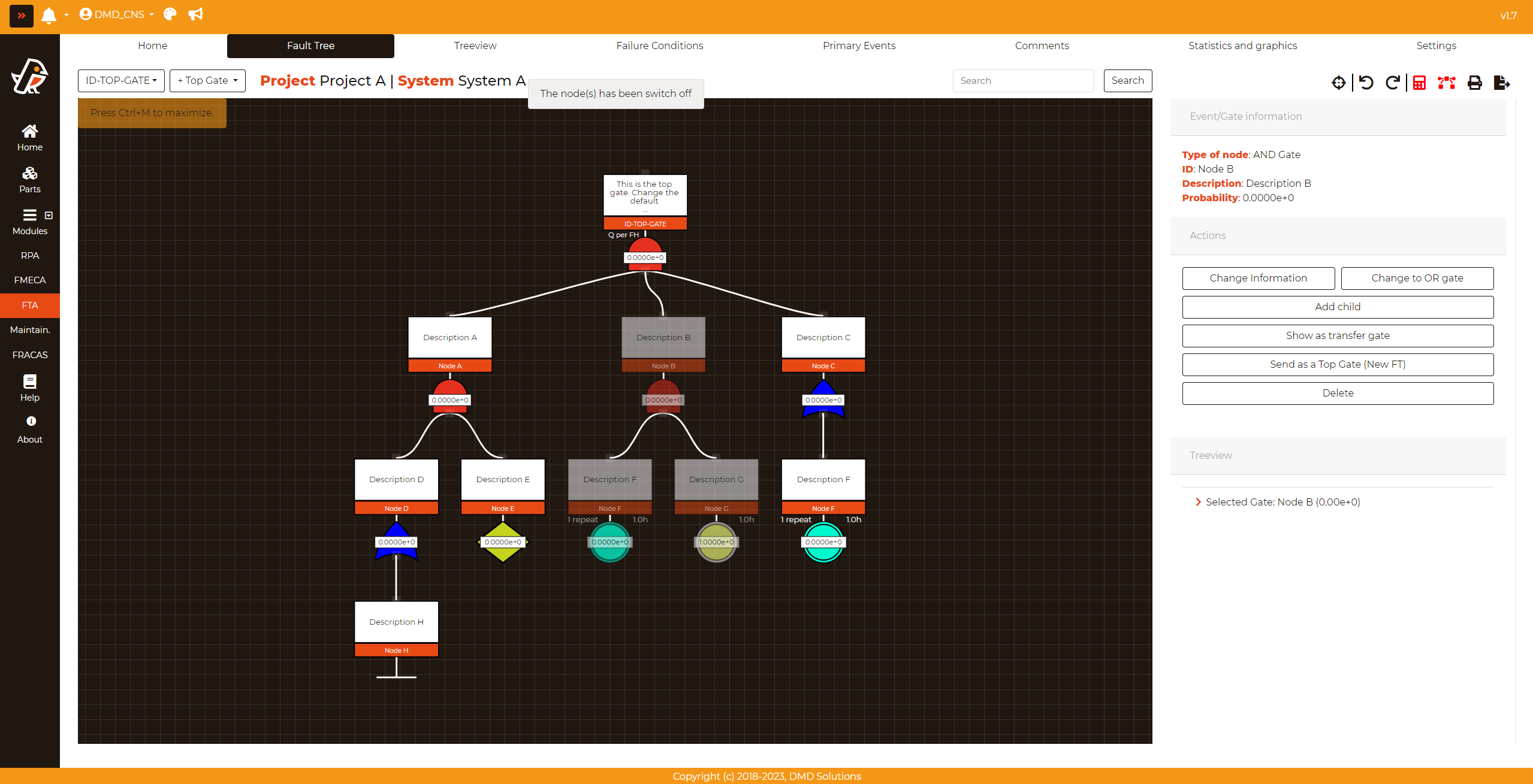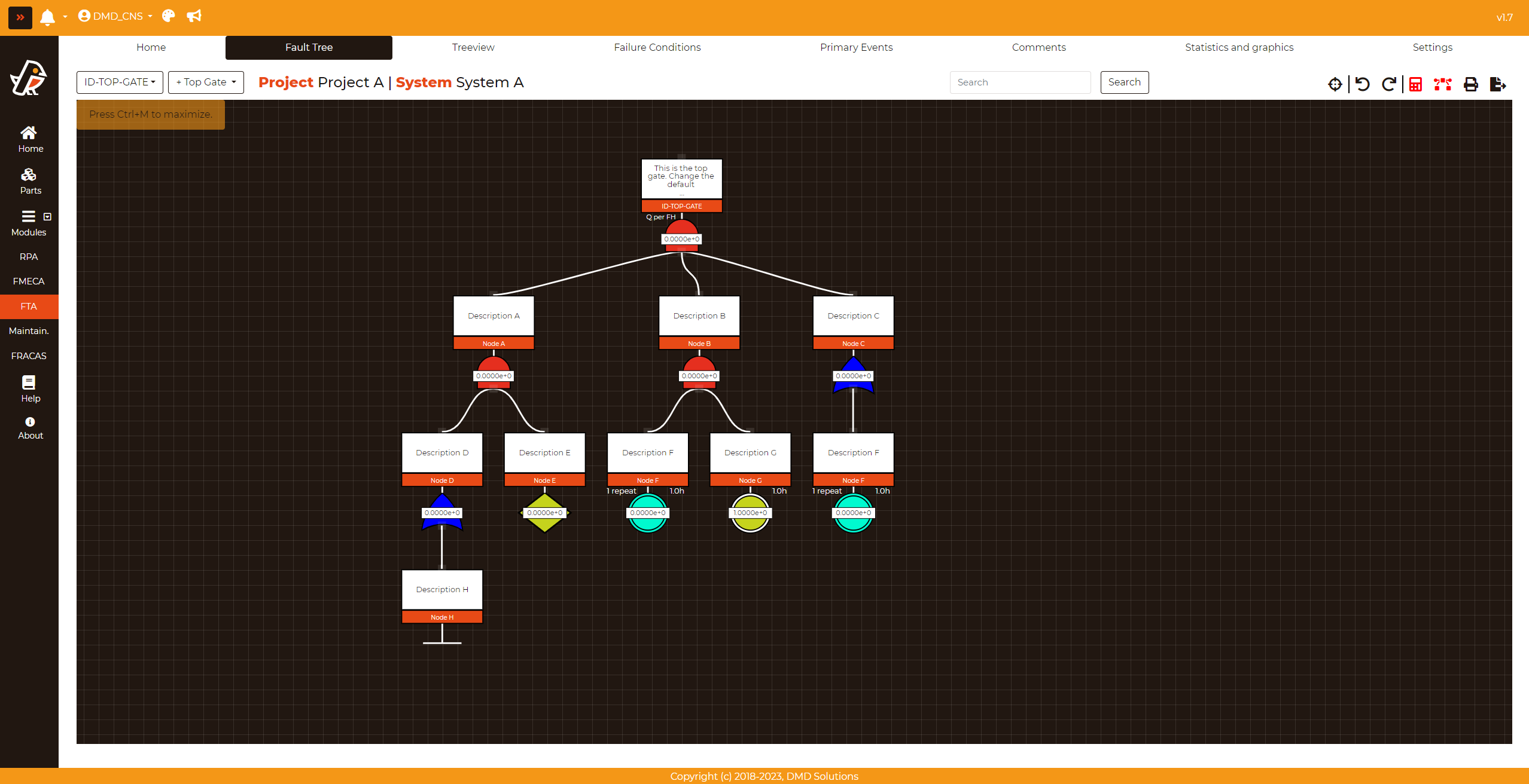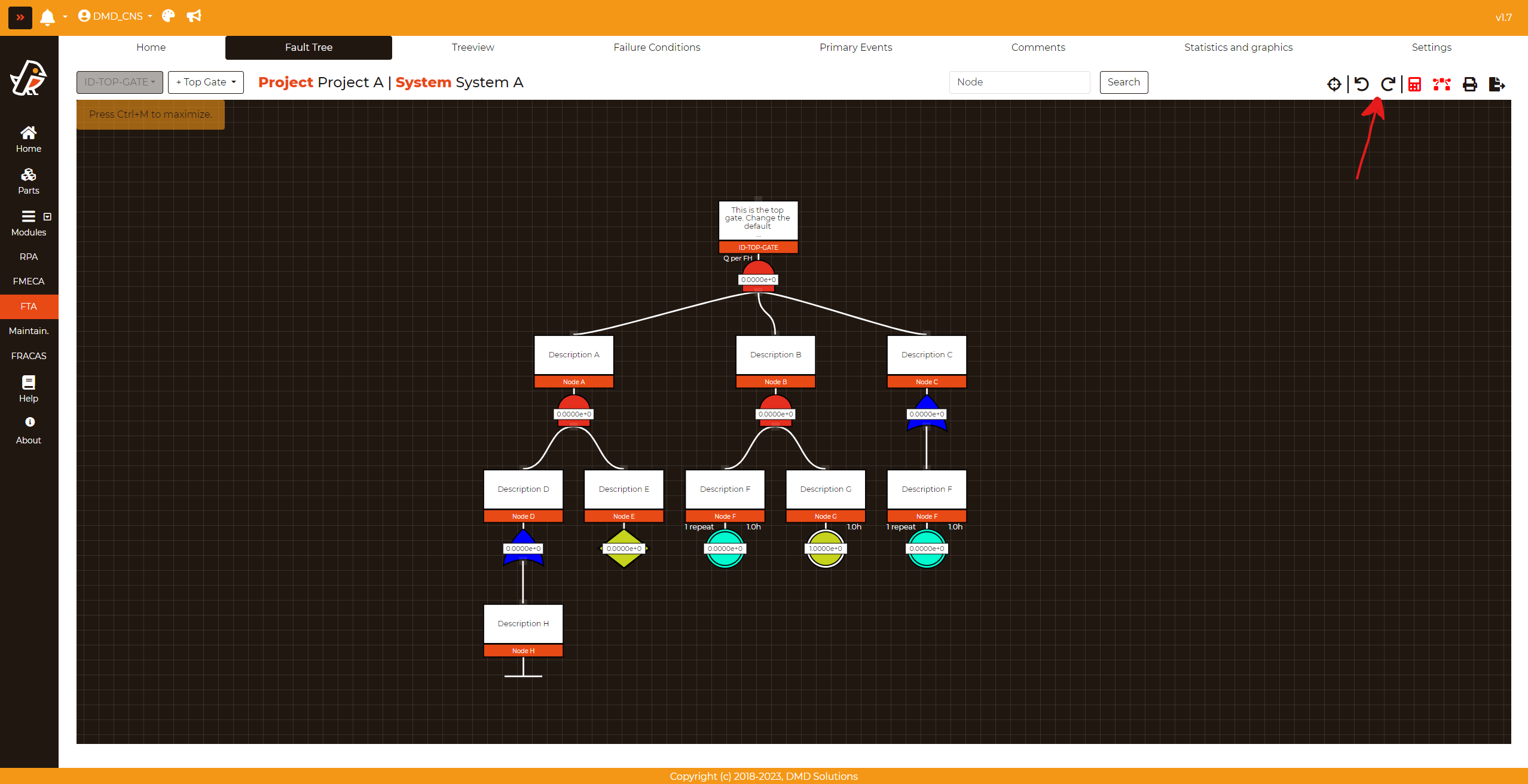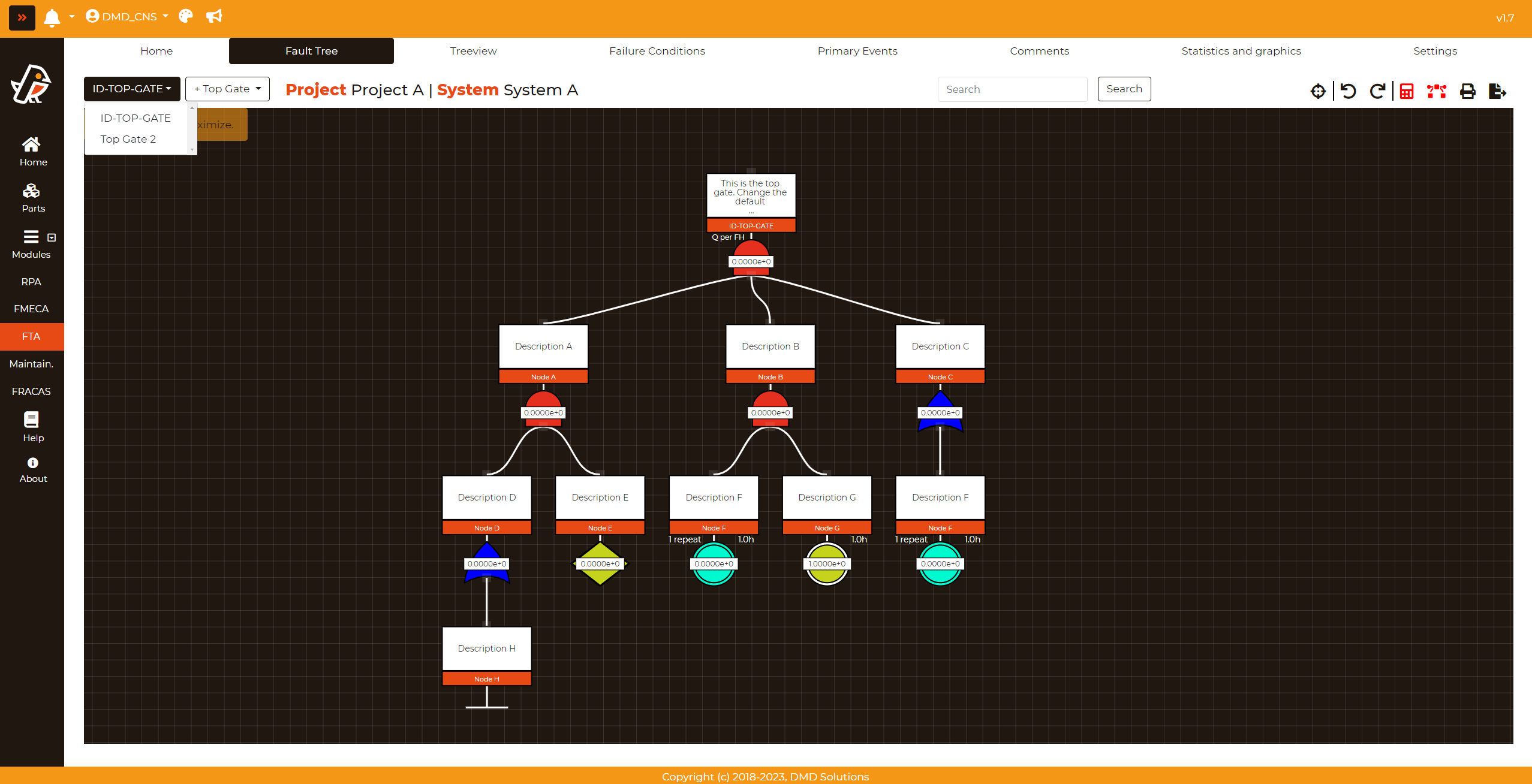 In the top-left dropdown, the user can change between the different Fault Trees of the system.