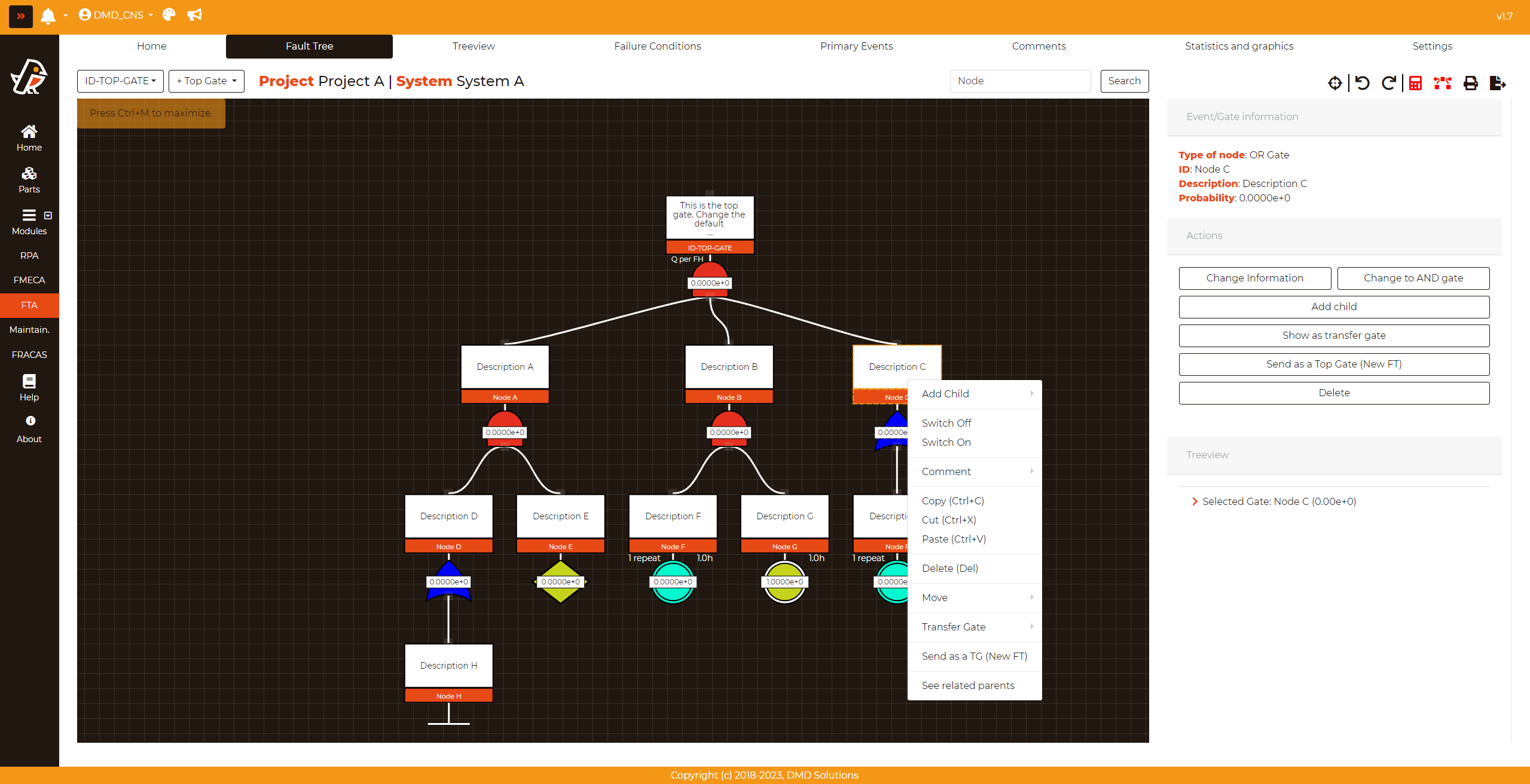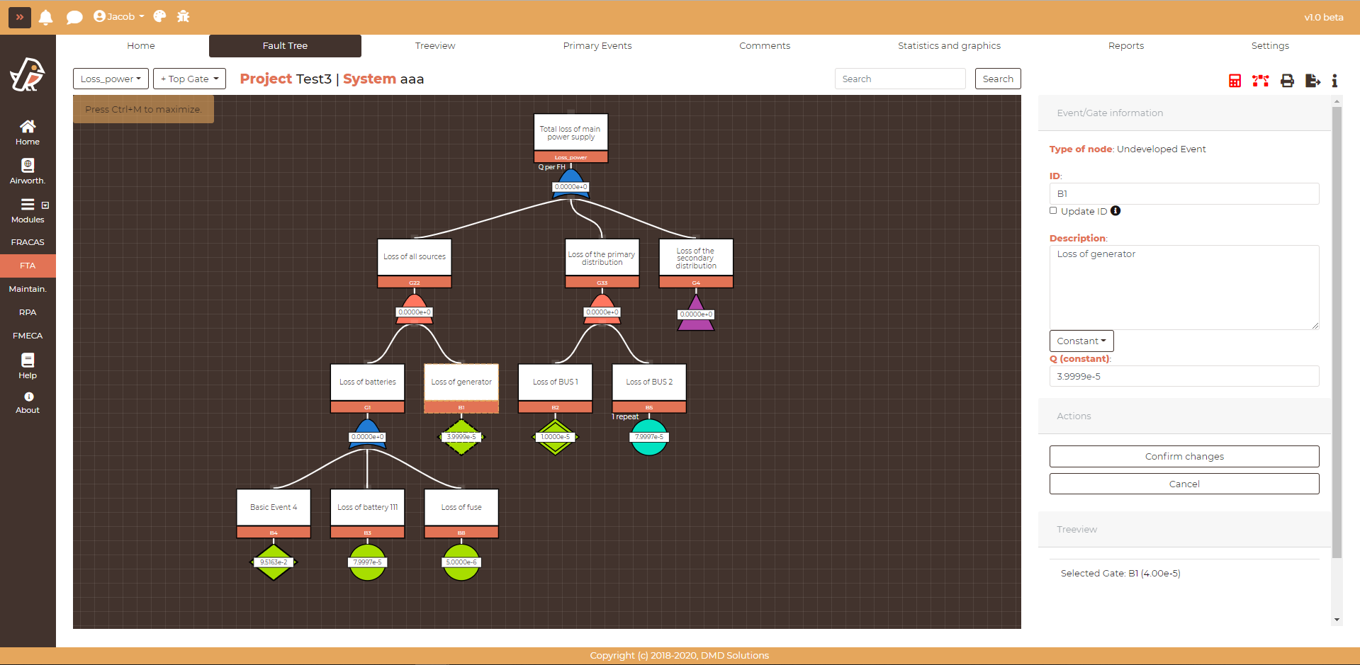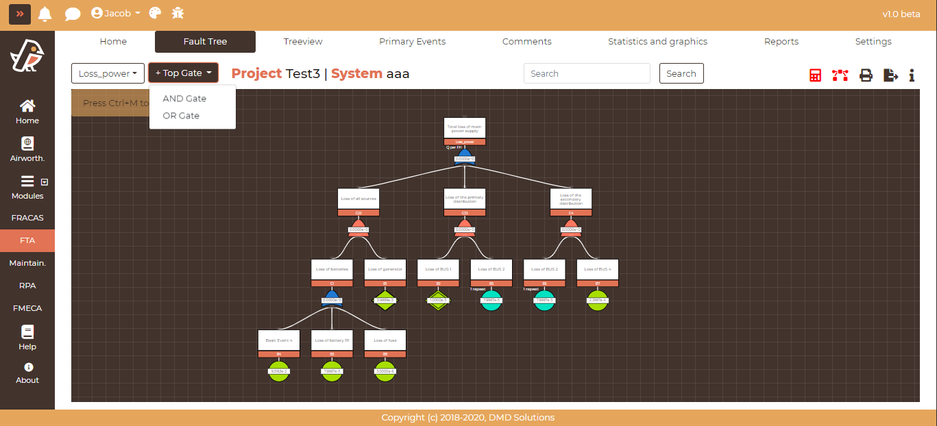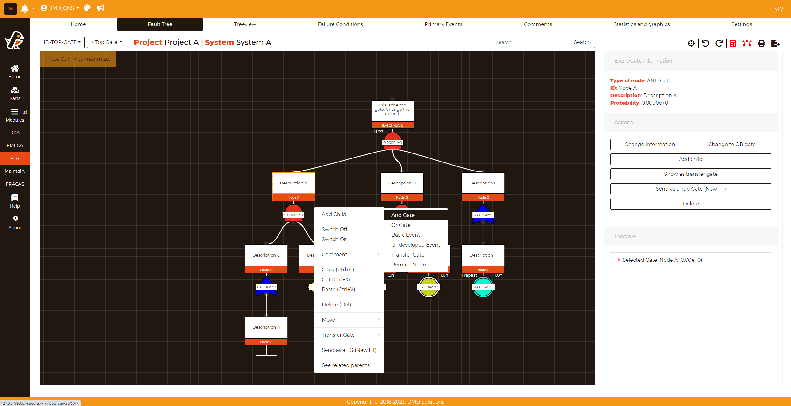 In the top-left dropdown, the user can change between the different Fault Trees of the system.