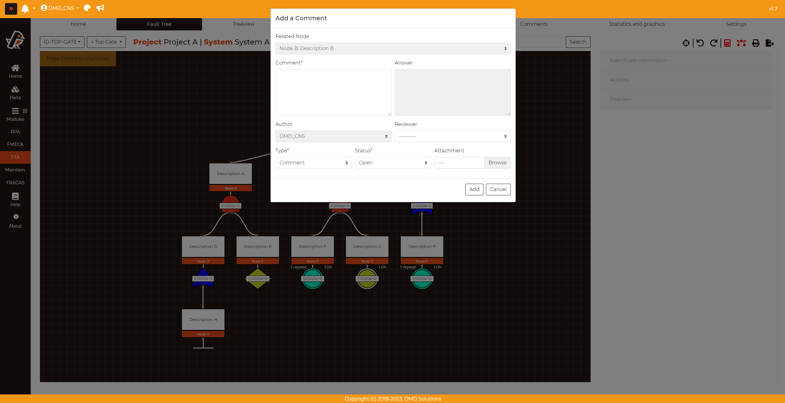 By clicking Add child, a new node can be inserted as a child of the selected node. There are different types of nodes that can be added (AND, OR, Basic, Undeveloped, Transfer and Remark).