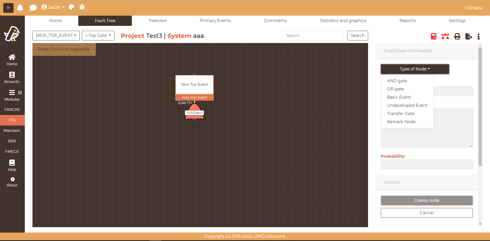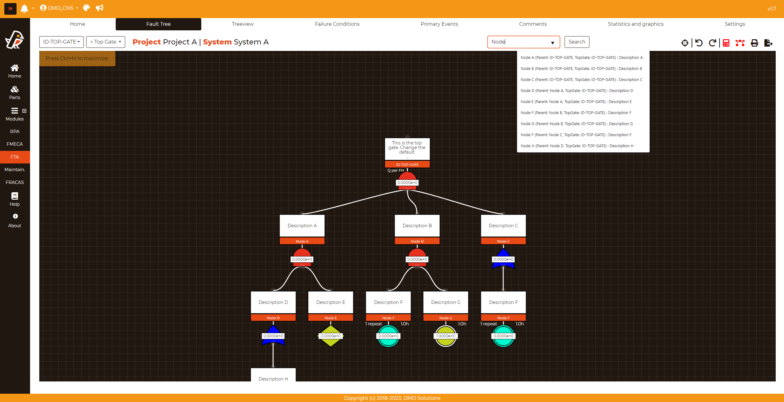 In the top-right text-box the user can search a node in the different Fault Trees of the system. Write the name of the node and click on Search.