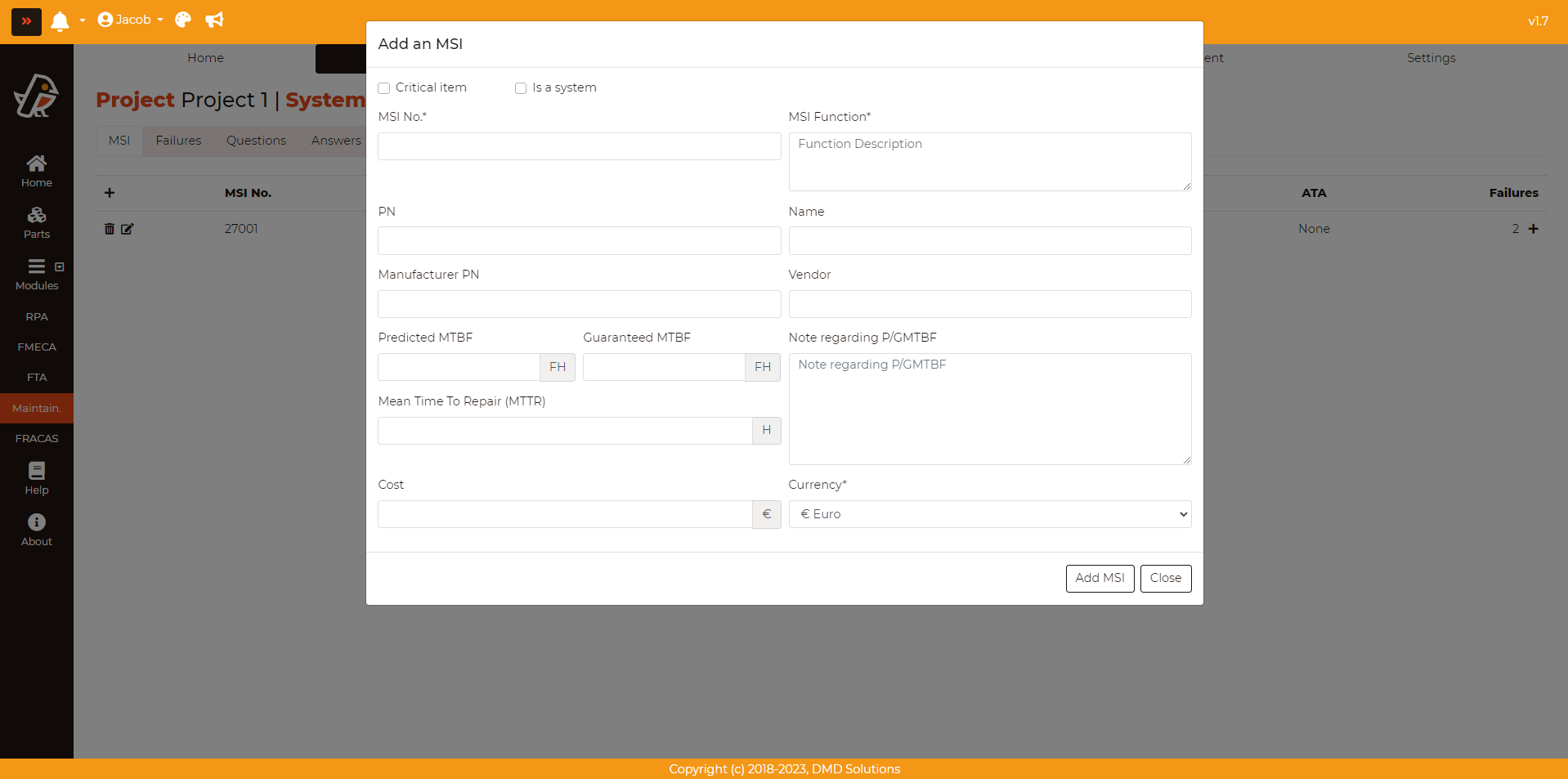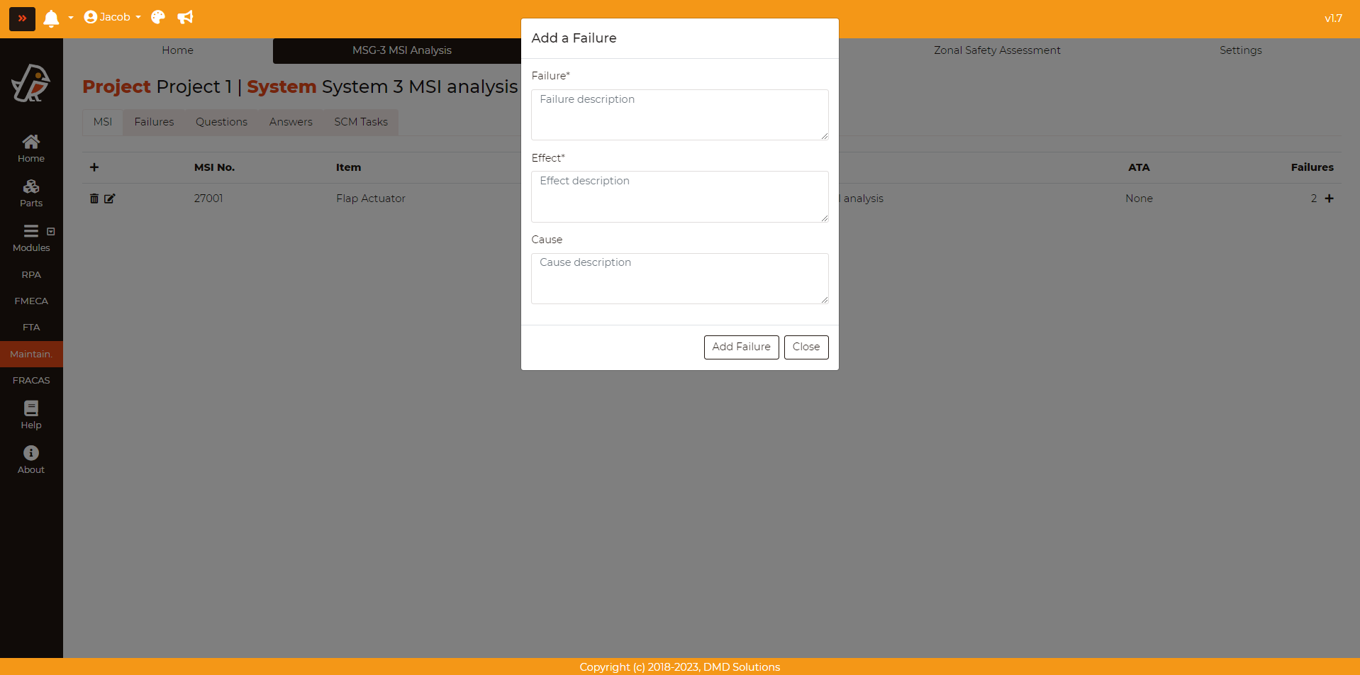 The failures can be added from this page by pressing Maintainability > MSG-3 MSI Analysis > MSI > Add button (Last column of the table). Fill the data of the opened form (check the Failures section) and click on the Add Failure button.