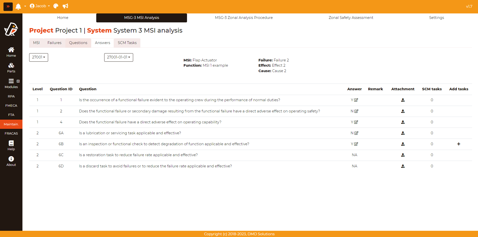 Once a failure has been analysed, it is possible to create the tasks if they are needed. Go to Maintainability > MSG-3 MSI Analysis > Answers and select a failure. All the answers related to that failure will be shown. The user can also access (and download) the attachments directly, edit answer and remark fields, and check the number of SCM tasks associated the each answer: