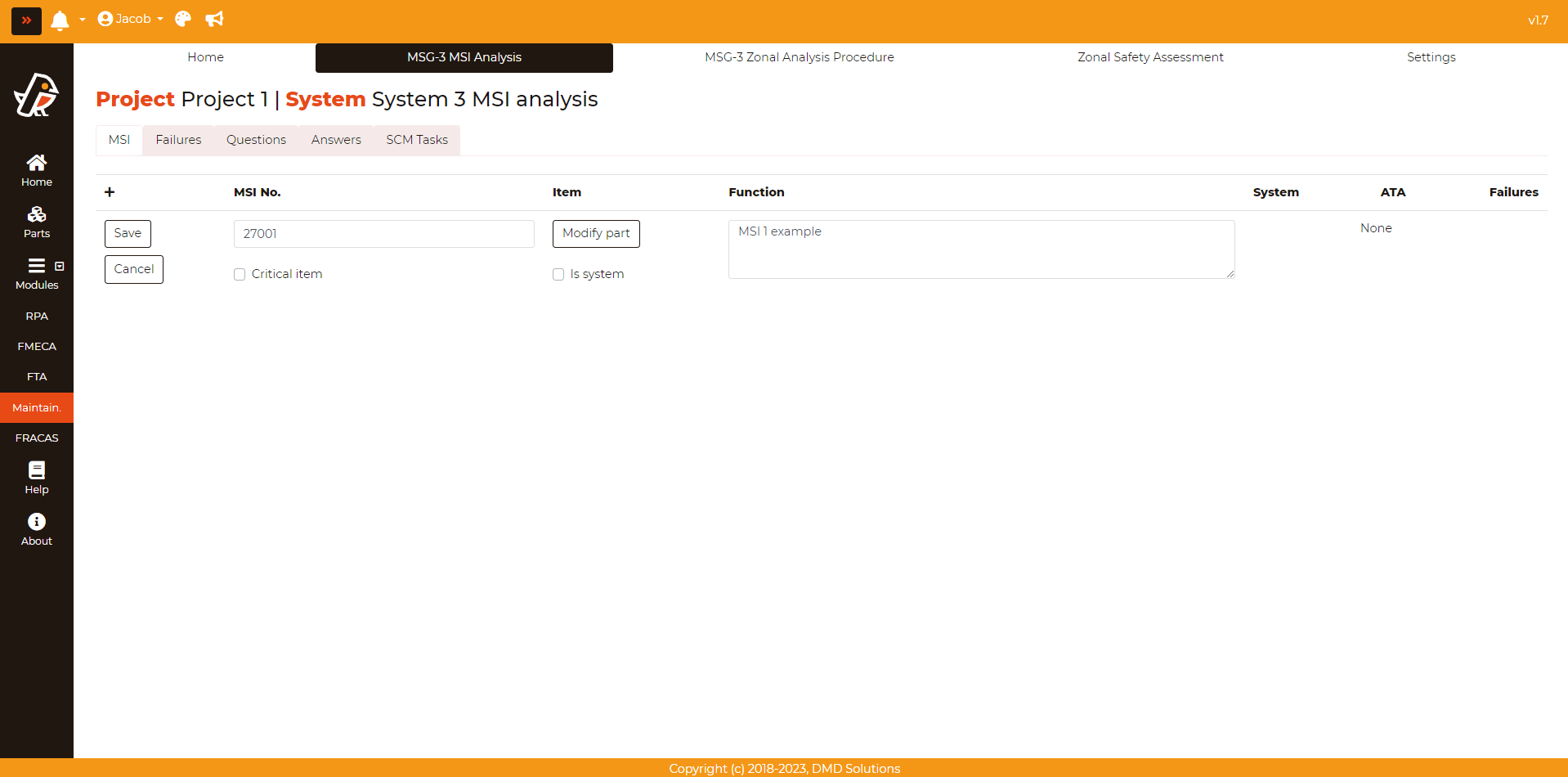 The added MSI can be edited pressing Maintainability > MSG-3 MSI Analysis > MSI > Edit button (First column of the table). Then, fill the opened form and click on the Save button to save the changes. Once added, the MSI will be listed in the table. If an MSI is a critical item, it will be highlighted in red color in the table.