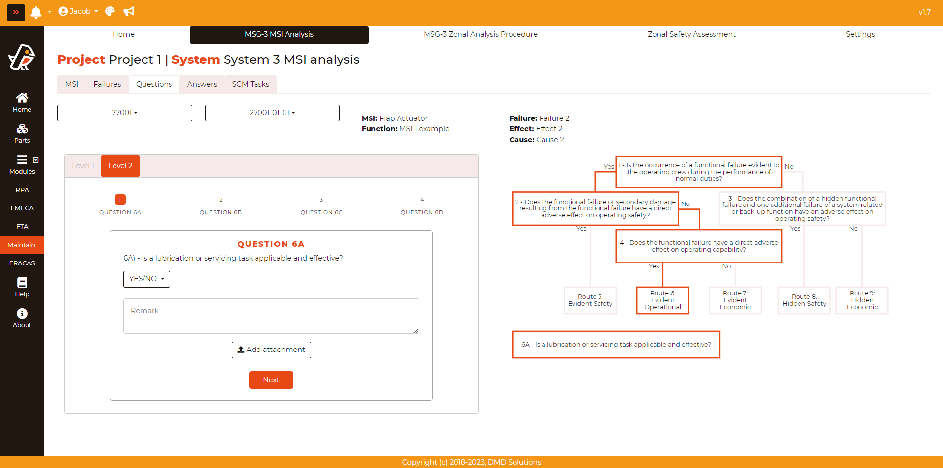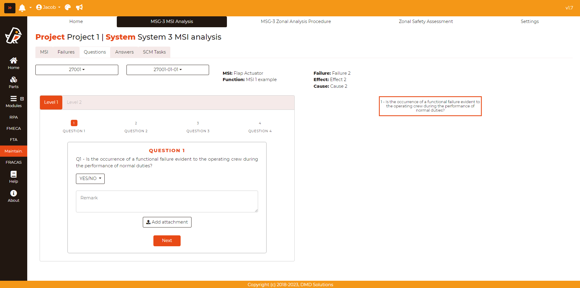 In the opened form, the answers, remarks, and attachments have to be filled. Robin will guide the user to the next questions according to the user’s answers. For each answer, the user can provide a remark and upload an attachment. After the last question from Level 1, the Failure Effect Categorization (FEC) will be shown.