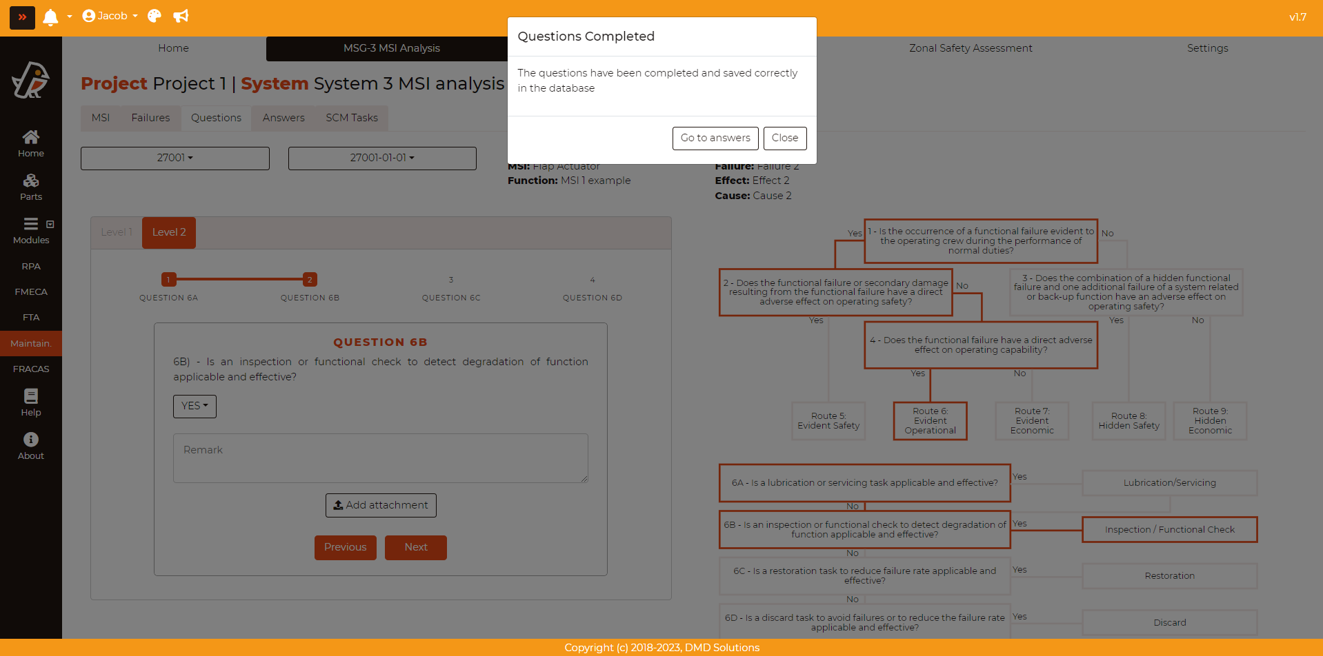 Once the questions from Level 2 are also completed, the user can either Go to answers or Close and select the corresponding MSI, failure and cause to observe it.