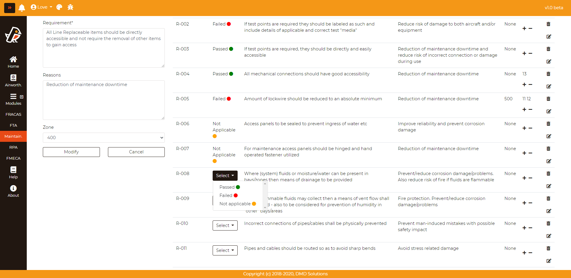 Deletebutton (last column of the requirements table).Change requirement status: The status can be Passed, Failed or Not Applicable. For each requirement, the user can select the status with the dropdown.
