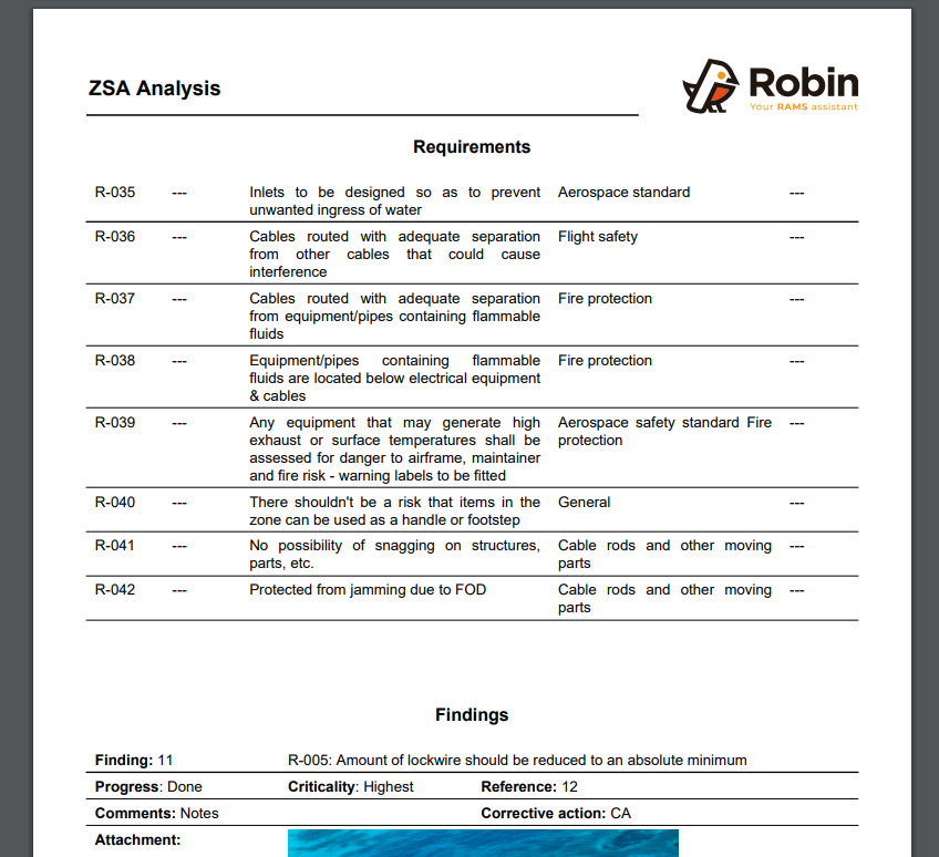 ZSA constitutes part of the safety assessment process of Aerospace Recommended Practice 4761 (ARP4761) – “Guidelines and Methods for Conducting the Safety Assessment Process on Civil Airborne Systems and Equipment”, which comprises the generation of requirements, as well as verification to support aircraft development activities.